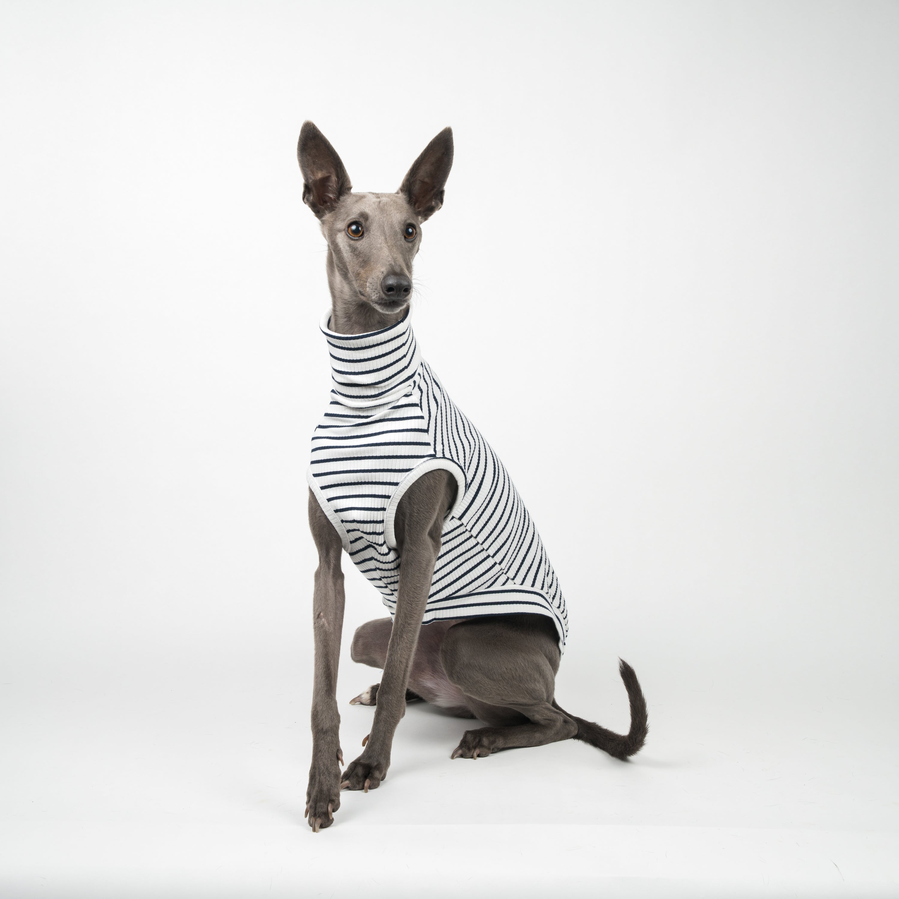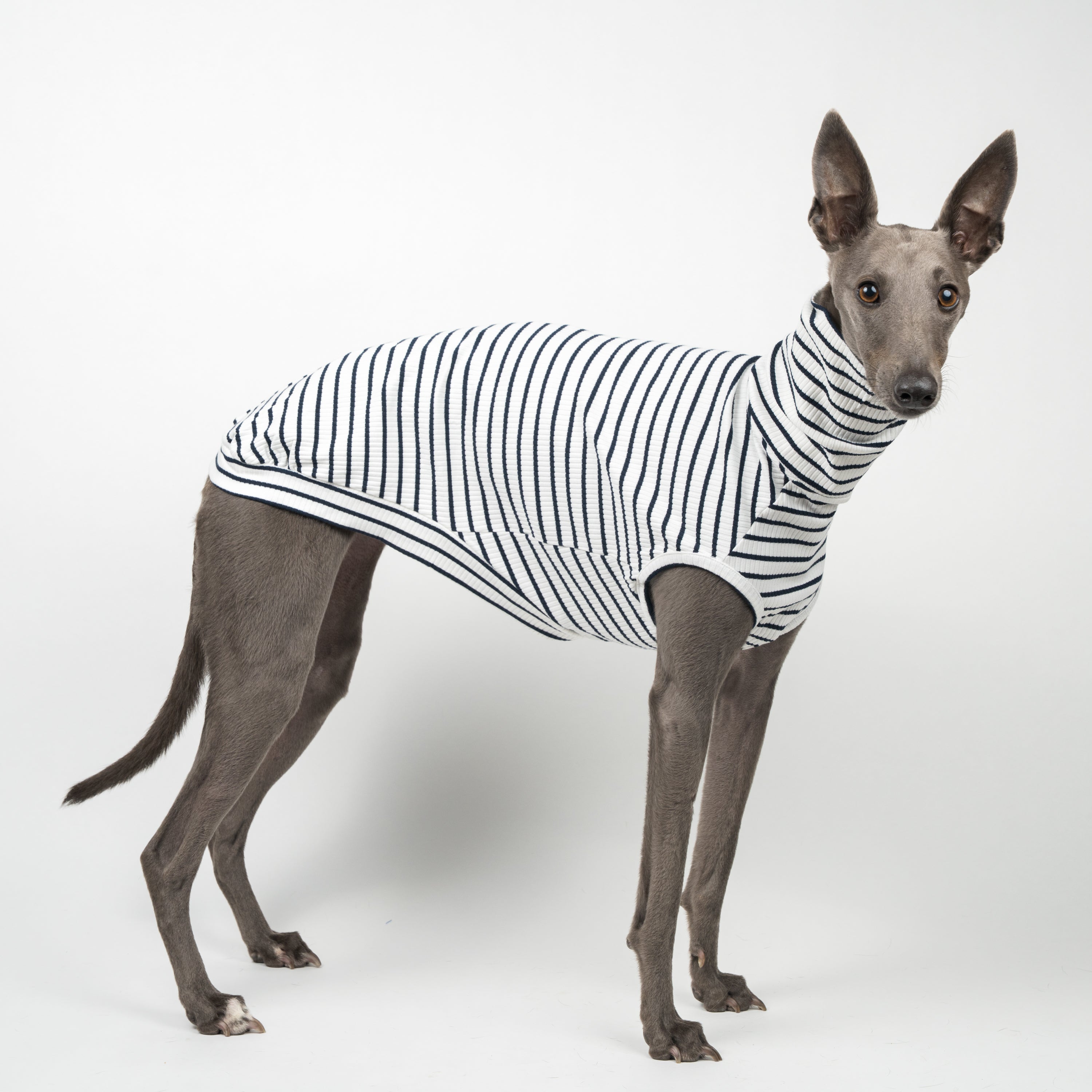 Snoot Stats: Georgie, runway Whippet extraordinaire, has a 59cm chest and wears a size Medium.